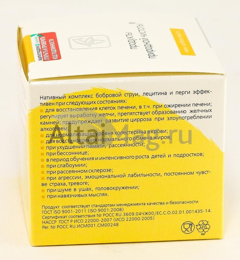 Комплекс бобровой струи, лецитина и перги эффективен при слабоумии, умственных нагрузках, рассеянном склерозе, ухудшении памяти, рассеянности, шуме в ушах, головокружении, агрессии, эмоциональной лабильности, постоянном чувстве страха, тревоге, бессоннице, навязчивых мыслях; для восстановления структуры печени, в том числе при ожирении печени; для нормализации уровня холестерина в крови.